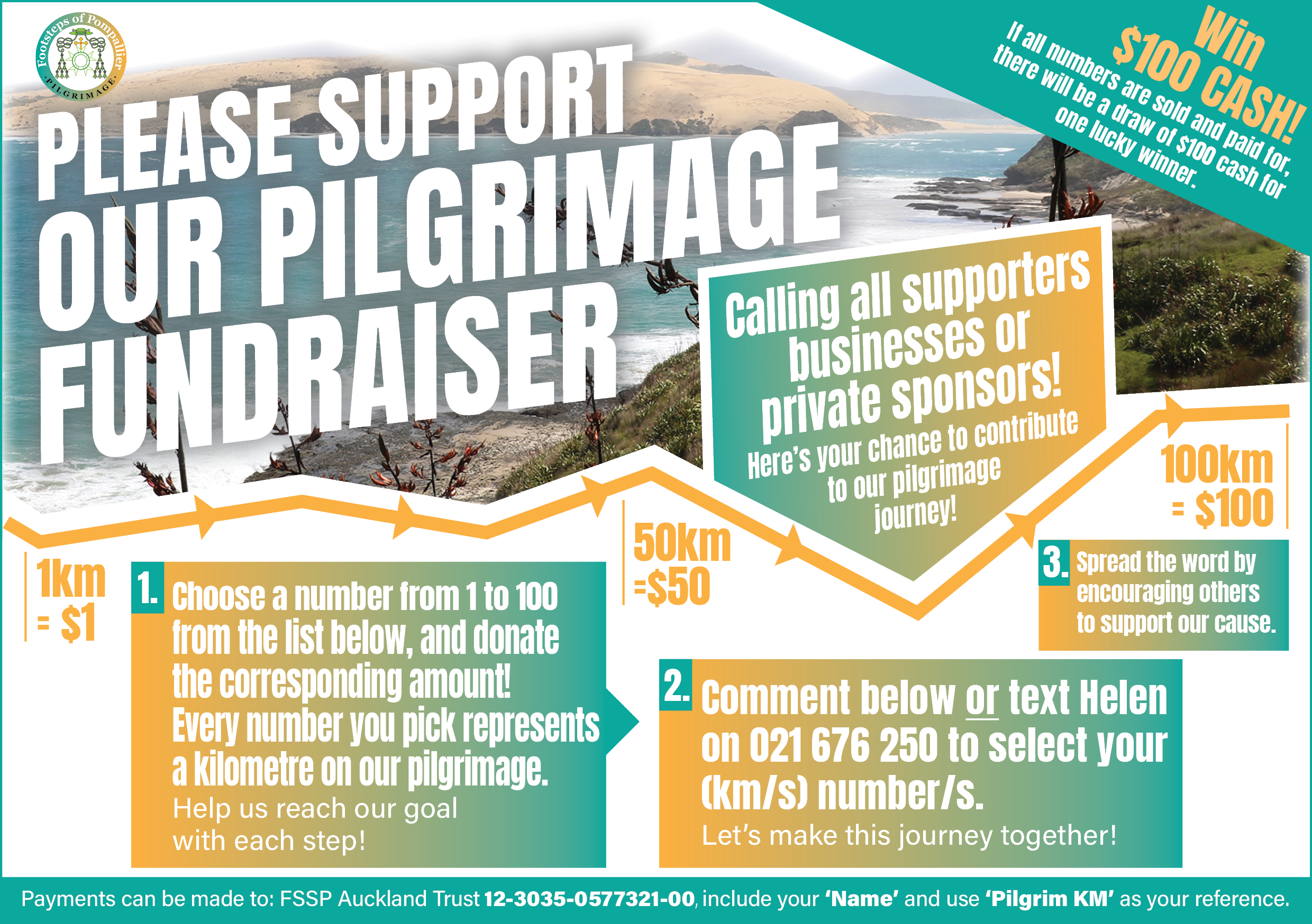 Purchase a specific kilometer by paying the amount in dollars corresponding to that kilometer number. Km #1 costs $1 and Km #100 costs $100. Pilgrims will pray for you during the pilgrimage plus win $100 cash.